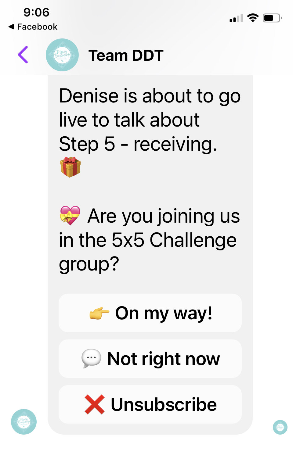 We decided to experiment with technology and set up an automated Facebook Messenger Bot. It was like having another super-efficient member of our team to sent participants reminders about the daily videos and lives.