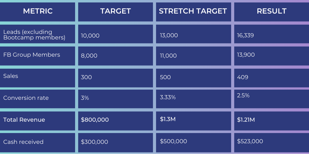 Lead generation and having people join the pop-up Facebook group. Marketing channels used: social media, email and ads (FB, IG, LinkedIn and, Pinterest)